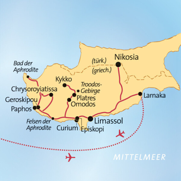 Sie besuchen heute das Kloster Chrysoroyiatissa. Anschließend führt Sie die Fahrt durch kontrastreiche Landschaften. Weiter geht es zum Bad der Aphrodite, einst Spa der Göttin der Schönheit. Nutzen Sie die Gelegenheit zu einer kleinen Wanderung entlang der schönsten Steilküste Zyperns.